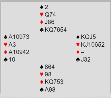 Kom Trondsen på banen med 2 spar- bud. Siden jeg hadde minimum valgte jeg å passe, men da kom Marthinussen inn med budet 3 ruter. Trondsen valgte å doble for å vise en to-farge hånd, jeg passet og det samme gjorde Arne.