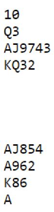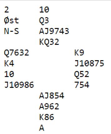 Å spille 6 ruter er bra. Det er enkelt tolv stikk om ruterfargen ordner seg. Gjør den det er det muligheter for alle tretten stikkene, for kanskje kan sparen settes opp og gi avkast for nords hjerter. Og om det blir en rutertaper kan det fortsatt vinnes tolv stikk om sparfargen er medgjørlig på en eller annen måte (K-Q-x, eller honnør-9 dobbelton hos øst). Slik så hele spillet ut: