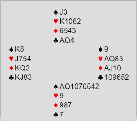 Ved det andre bordet meldte BAK sin syd 1 spar etter 1 kløver - 1 hjerter fra vest og øst. Jeg forstår ikke helt 1 spar selv om også jeg ser soneforholdene. Vest støttet hjerteren, og øst meldte 4 hjerter. Etter to passer doblet nord. Den doblingen er vel ganske tvilsom selv om han på en måte har fått litt feil informasjon, syds innmelding 1 spar?