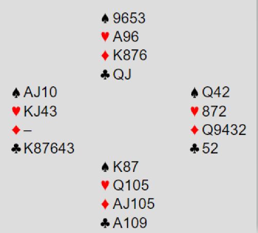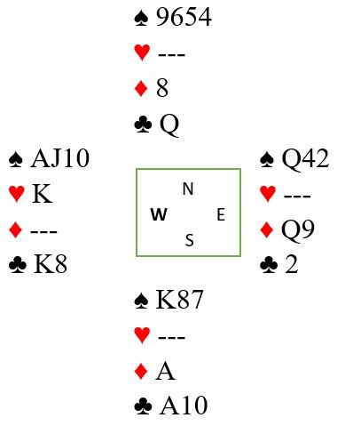 Vest spilte ut liten kløver som ble vunnet hos nord. Første tanke er kanskje å ta rutefinesse over åpneren, men Ingunn tenkte nok at det haster ikke. Det er ikke farlig å slippe inn vest. Så hun startet med liten hjerter til tieren og vests knekt. Vest var temmelig innspilt og måtte gi spillefører en favør på en eller annen måte. Hun fortsatte med liten hjerter som fikk seile til syds dame. Nå var det plutselig mer case for ruterlengde hos øst siden vest har kløverfarge, og trolig hjerterfarge også. Så Ingunn traff ruteren med liten til kongen og ruter til markert finesse (siden vest var renons) med tieren. Så over på hjerter ess og nok en ruterfinesse. Vest fikk pustebesvær da hun måtte kaste på alle disse ruterne. Før den siste ruteren så det slik ut: