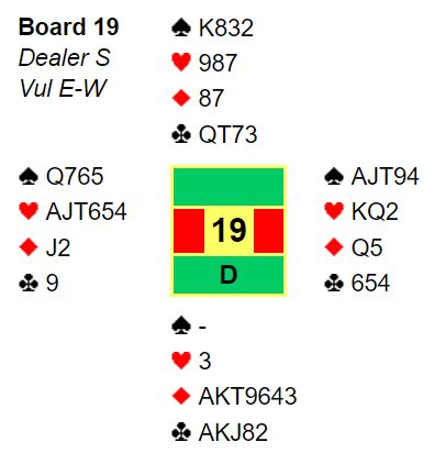 Hans var sikker på at Astrid måtte ha majorfarge og meldte derfor frivillig med 5-5 i major selv om 7 hp ikke er så mye. Astrid var nok i tvil om lengden hans i hjerter men håpte den var lang og god nok, men det stemte ikke. Ru D ut , styrke fra meg og esset i bordet vant. Lindberg spilte så liten trumf til egen - er og Øst fikk på singel 9-er.Ru opp førte til at Hans trumfet på hånden og spilte kløver til 10 fulgt av hj D som jeg nå kunne stikke og ta en runnde trumf til samt hj 7 so, felte hj D. Deretter fikk vi ruterstikk med fire bet som resultat. Og knepen seier for kvelden!
