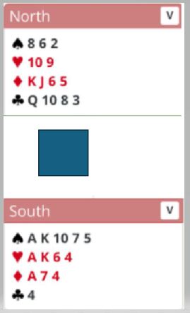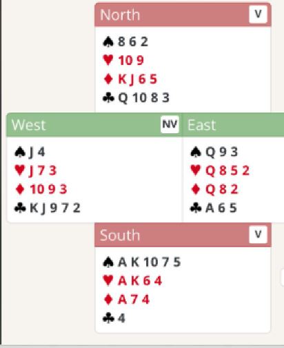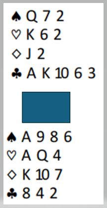 Riktig spill er hvis du vant med ruter knekt å spille hjerter til hånden og kløver opp. (Hvis du vant første stik med ruter 10 spilles liten kløver mot nord i andre stikk) Hvis vest slenger på kløver dame med det samme legger du elegant liten fra nord og øst får ikke komme inn. Hvis vest legger liten i første kløverrunde spilt fra syd stikkes med esset, hjerter til hånden en gang til og kløver opp mot nord en andre gang. Da kommer kløverdamen på, og du lar vest beholde det stikket. Nå er det safe, ruter konge dobbel er beskyttet med vest inne, og du vinner 1+3+1+4 = 9 stikk, utgang til bokføring. Hvis øst får komme inn i kløver blir det to bet.