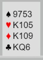 Å spille ut kløver konge kunne selvsagt vært bra, og vil ikke vært så fælt som det var her veldig ofte. Men det utspillet er nok en alt for stor sats å ta. Og her ble det helt fryktelig. Kongen tok med seg liten fra vest, knekten fra nord og kløver ess fra øst. Spillefører (Markus Lund) fortsatte med kløver og fikk totalt seks kløverstikk!