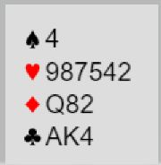 Kaja Brekke (vest) sin dobling av 1 spar var støttedobling som viste eksakt trekorts hjerter. Idet N/S var i 4 spar fikk Kaja vist sine kort godt med meldingen 5 kløver. Vegard korrigerte til 5 hjerter. Syd som satt med tre ess og en makker som hadde vært med i meldingene syntes at nå fikk det være nok: dobler.