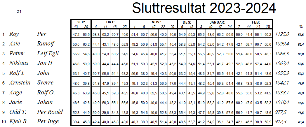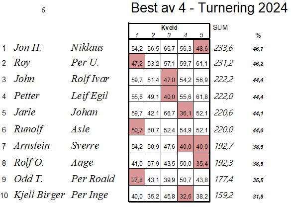 Etter tredje kveld av vårturneringen er normalen gjenopprettet, Arve og Arild har overtatt i tet. Siden dette var en simultanturnering så kommer ikke HCP-tallene opp, de står som etter to kvelder.. Av 163 deltagende par så ble Arve og Arild nr 10, gratulerer, men Knut og John Ivar klarte aandreplassen, imponerende. Sammenlagtresultatene etter tre kvelder finner dere under les mere...