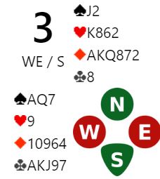 De aller fleste havner vel i 6 spar som Ø/V. Og det gjorde de fleste i Bodø også, kun ett par var i utgang. Men ett par til hadde et annet resultat enn +1010 som det blir i 6 spar hvor ruterfinessen går og gir det trettende stikket. Klukowski-Helgemo var i 7 hjerter med kun 4-3 tilpasning i trumf!