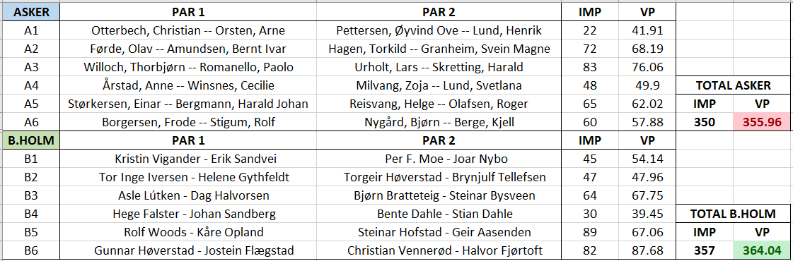 Først må det nevnes at da vi her i bloggen før lagfinalen startet presenterte lagoppstillingene tok jeg bare en screenshot av det som stod på listen som lå ute på nettet, og da hadde mitt utpekte favorittlag som nå leder kun fire spillere oppført. Det er Bergen AK 1 - Bakke som foruten C. Bakke, Helgemo, Grude og Charlsen har med Thor Erik Hoftaniska og Martin Andresen også, og de har så langt har bidratt godt. Det har alle spillerne på lederlaget, og de leder med finalen 11,7 VP etter fire kamper. Men i siste halvrunde i 4. kamp som ble spilt i morgens klarte Kristiansand BK - Olsen å vinne settet, så Bergen AK 1 sin seier i den kampen ikke ble så stor.