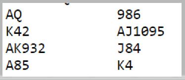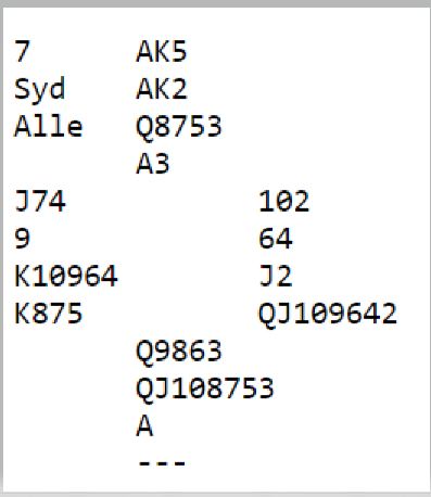 Ved det andre bordet passet nord i første hånd, og Ø/V fikk melde i fred etter 2 kløveråpning fra øst. Hoftaniska-Charlsen meldte med bra styring til 7 ruter. Siden trumfen ikke satt 4-0 var det tidlig "claim" da tre runder trumf kan tas ut før en spar og en kløver kastes på hjerteren. Vests fjerde kløver kan så trumfes med østs siste trumf. Så det ble +2140 og 13 IMP til lederlaget som trolig er norgesmestre søndag ettermiddag.