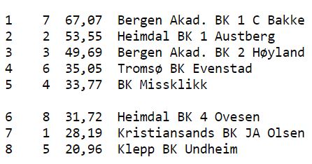 Dermed blir den største spenningen kampen om sølv og bronse. Bergen AK 2 har over 8 VP margin ned til Heimdal BK 1 - Austberg på tredjeplass. Så gull og sølv vil mest sannsynlig gå til Bergen, men en vet aldri. Bak Heimdal er det Kristiansand BK - Olsen som er nærmest, og de må hente inn 6,3 VP på trønderne om det skal blir sørlandsk medalje.