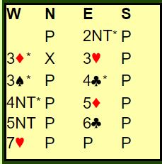 Forklaring: vi bruker overføringssvar på 1 kløver, og det var borte for meg et øyeblikk. Jeg hadde altså ikke vist firekorts hjerter, men firekorts spar og renons i hjerter!