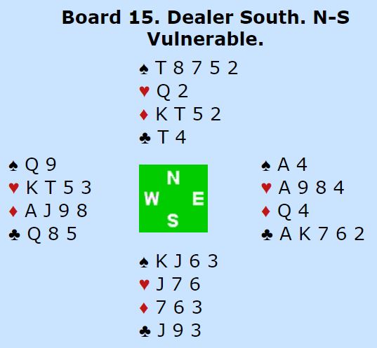 Englands øst svarte 2 kløver. Vest sa 2 ruter som antagelig var en slags hvilemelding, Øst viste hjerterfargen, og vest støttet. Jeg kjenner ikke detaljene i det engelse parets system, men etter den starten endte de i slem.