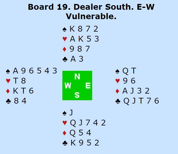 Der Sofie Græsholt Sjødal satt nord og Kaja Brekke syd passet først både Kaja (syd) og vest. Sofie (nord) sa 1 ruter, Kaja svarte 1 hjerter før vest nå hoppet inn med 2 spar. Å si 3 hjerter andre gangen betyr ikke helt det samme når motparten tar bort melderom som et hopp til 3 hjerter ville vist om vest hadde passet. Men man bør kanskje ikke støtte et 1-over-1 svar til 3 i en sånn situasjon uten noe bedre enn en minimum 12-14 hånd. Her hadde Sofie en veldig fin 14 poenger, masse kontroller osv., og hun sa som man bør gjøre 3 hjerter. Kaja løftet til utgang, og det kom kløver ut fra vest. Spar konge ble etter hvert godspilt, og vest kunne betet utgangen om hun hadde funnet skift til liten ruter slik at Ø/V får tak tre ruterstikk. Men det gjorde hun ikke, og da forsvant en ruter på nords spar konge. Det ble kun to rutertapere og en taper i spar, Norge + 420.