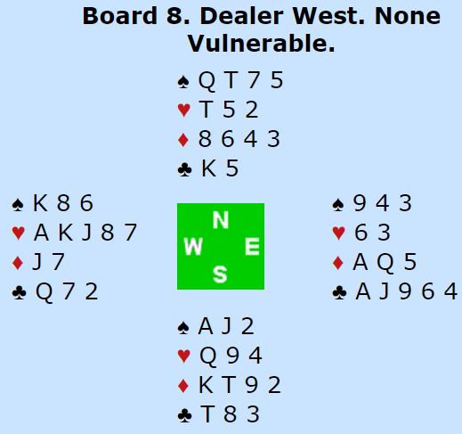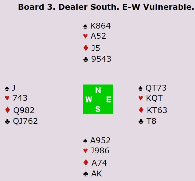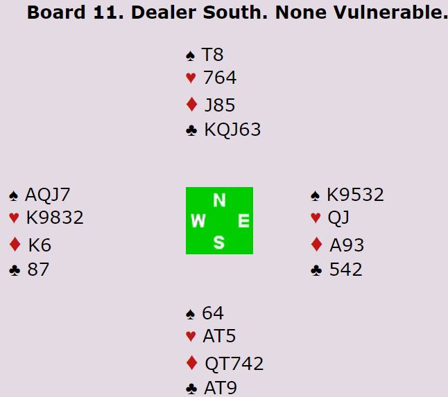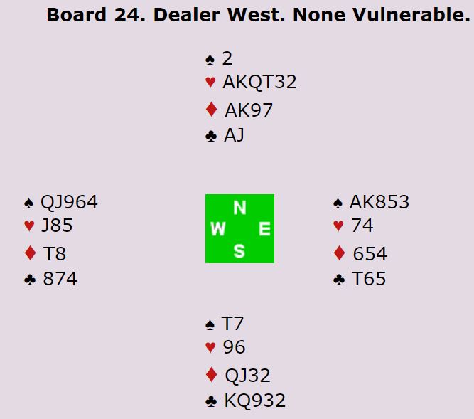 Det samme skjedde der Belgia satt N/S, men bortsett fra de to gikk nesten halvparten av N/S-parene en eller to bet i 4 spar. Resten spilte delkontrakter, de fleste i 1NT som greit ble vunnet med syv eller åtte stikk.