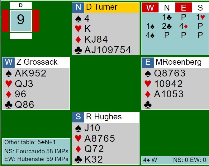 Det er egentlig bet samme hvem som spiller 4 spar, men bare i teorien. I praksis kan vel neppe øst klandres for å spille ut hjerterhonnør. Dermed ble det kun en hjertertaper, og tre hjerterstikk til spillefører. Den fjerde hjerteren ga avkast for en ruter. Drijver snellet hjem ti stikk og vant med det 10 IMP for Sveits da N/S ved det andre bordet spilte 4 spar med to bet.