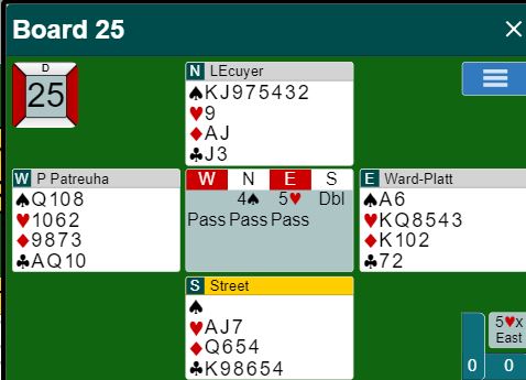 I 5 hjerter er det minst to doblede bet, men da røyken hadde lagt seg var spillefører gått fire doblede, N/S +1100. Spillet ga 15 IMP til STREET, størstedelen av ledelsen deres halvveis i kampen.
