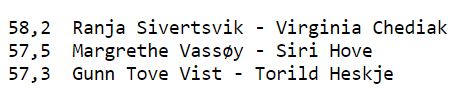 I dameklassen deltok 31 par. Pallen ble seende slik ut: