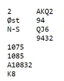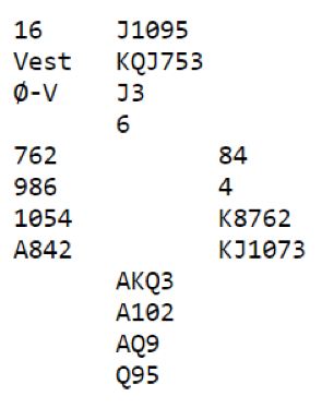 Så alle de som endte i 6 hjerter og måtte prøve ruterfinessen for å komme til tolv stikk vant den også, mens det altså er tolv toppstikk i sparkontrakt samme hvor ruter konge er plassert. Omtrent halvparten av N/S-parene var i lilleslem og vant den på dette spillet, kun to av dem i sparkontrakt.