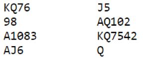 Som du ser er det ved å se kun på N/S sine kort suverent i 6 spar. Det sitter komfortabelt 3-2 i trumfargen spar, og etter å ha trumfet ut i tre runder kan hjertefargen brukes for avkast av to rutere og en kløver. Det blir kun ett kløverstikk til forsvaret, og ruterfinesse er unødvendig. I hjerterkontrakt som det er mer naturlig å havne i er det kun elleve stikk fra taket, det tolvte kan kun komme via en vellykket ruterfinesse.