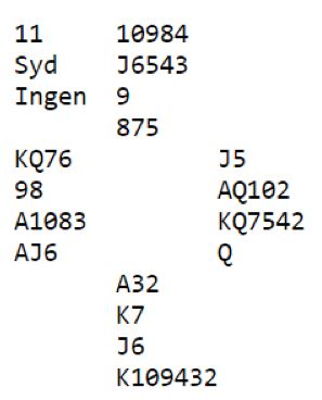 Merkelig konklusjon: I begge de mulige trumffargene har man alle de største kortene. De har åtte kort til sammen i spar og åtte kort til sammen i ruter. I ruterkontrakt er det tretten stikk, i sparkontrakt elleve...