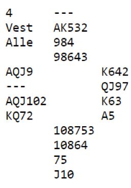 Her er et skreddersydd eksempel hvor det var fantastisk å spille med 4-4 tilpasning i spar (åtte trumf) som trumf i stedet for 6-3 tilpasning i hjerter (ni trumf)! Det var dog fantastisk kun i teorien, for slik det satt i det spillet fra NM Monrad Lag spilte det i praksis ingen rolle hvilken trumffarge man valgte.