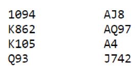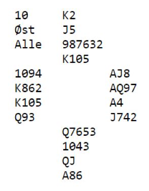 Ruteren ga tre stikk! Så de som var i 3NT og så at forsvaret fikk satt opp sparfargen, og kløver til nieren hadde gått galt, måtte bare cashe ut for en bet. Trodde de. Men så datt det niende stikket i fanget på dem for ruter 10 (2+4+3+0=9). Heldig!