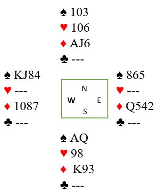 Altså, i de tilfellene øst har spar konge (i teorien 50%) vinnes alltid ved å spille A-Q i sluttpossen. Og i de tilfellene vest har spar konge (den andre 50%'eren) vinnes om ett av to kort sitter riktig; vest må ha ruter 10 eller ruter dame. Det er 75% av den 50%'eren hvor vest har spar konge, dvs. 37,5%. Totalt gir dette så vidt jeg kan forstå 87,5% sjanse for å vinne tolv stikk om det spilles slik. Den eneste gangen det blir bet er om vest har spar konge og øst har Q-10 i ruter.