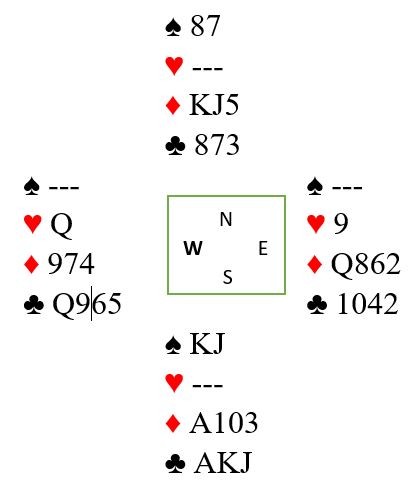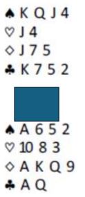 Som du ser vil en eventuell kløverfinesse mislykkes, og etter det vil det bli tipping i ruter, med ti stikk eller en bet som resultat.