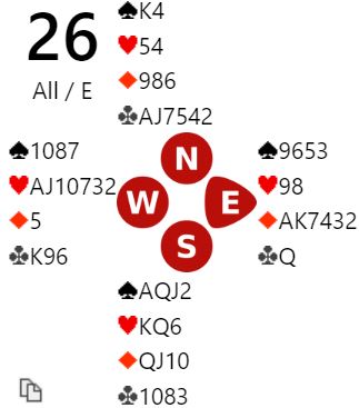 Ved det andre bordet hoppet syd til 4 ruter over åpnerens 2 spar i andre melderunde. Nord kunne nesten ikke ha bedre kort enn han hadde mot syds single ruter, så han gikk rett i 4NT – Key Card Blackwood før de endte i 6 spar, 13 IMP i sving.