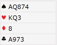 Vest passer, og Ø/V passer resten av meldingsforløpet. Makker (nord) åpner med 1 ruter og du svarer 1 spar. Det kommer 2 spar fra makker og det er din tur. Det er selvsagt utgang her, men det kan stå slem også. Hva melder du?