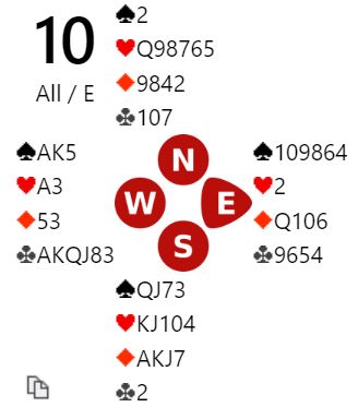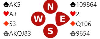 De har jo åtte spar til sammen som ofte tilsier trumfkontrakt, men hva er best i dette tilfellet? Det kan nok diskuteres. Hvis nord har en topphonnør i ruter og syd honnør-knekt vil det fort gå galt i 3NT. Og 4 spar kan i så fall stå om det er kun to rutertapere og en sparstaper. Men det kan godt være slik at 3NT er det som vinnes og 4 spar går bet også. Og slik var det: