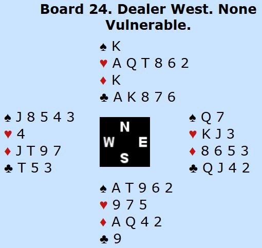 Min unge makker (21 år) som debuterte i VM-sammenheng er flink, og han gjorde mye bra i Buenos Aires. Selvsagt ble ting feil innimelmom (det gjorde det for meg og). Som oftest når han tråkket feil var det pga. mangel på erfaring, og det er jo naturlig. Det er kanskje litt stygt å dra fram dette spillet, men det er så spesielt at han må ha meg unnskyldt for å fortelle det. Det er også en spesiell og fin sluttsposisjon etter at dramaet om de forsvunnede FIRE trumfstikkene var over.