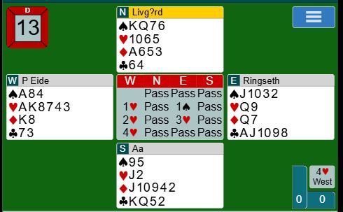 Det svenske damelaget er svært merittert, og selv om det norske laget ble europamestre i år var kanskje svenskene hårfine favoritter før denne kvartfinalen. Men som sagt er denne kampen langt i fra over. Her ett spill som viser at svenskene kan være sårbare de og. Du kan kanskje se på det som en meldeprøve med kun Ø/V sine kort.