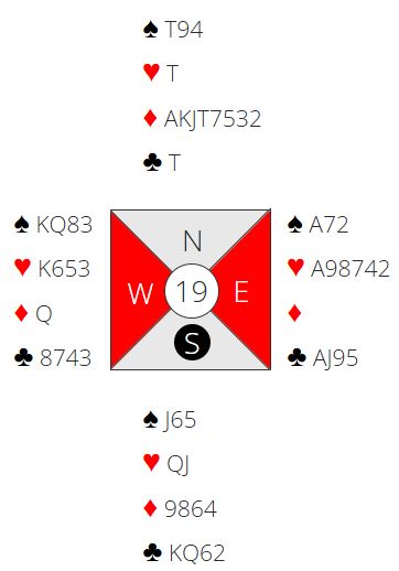 Det var en rekke ruterkontrakter på forskjellige trinn. Så kom det en rekke utganger i hjerter, og syv av dem fikk +650 for elleve stikk. Selv om det egentlig er ett stikk for lite ga det +18 (av +68 mulige). De som fikk tolv stikk i utgang (+680) noterte pene +40. Noen av dem fikk det veldig enkelt da syd spilte ut kløver konge som tok med seg tieren og esset - kun en kløvertaper.