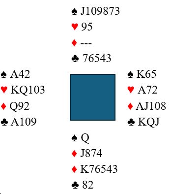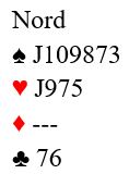 Vi teller opp det vi VET: nord var fra start renons i ruter og hadde sekskorts spar pluss femkorts kløver. Det er elleve kort, og da har han eksakt to kort i hjerter!