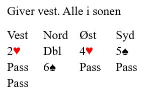 I tredje ruterrunde kaster nemlig vest en hjerter, og hele sitsen i dette spillet har blitt som en åpen bok. Vest er den som må ha kløverlengden, for hun hadde jo kun to rutere og en spar fra start. Kløver ess spilles, så kløver til damen og sitsen som du på et vis visste om på dette tidspunktet åpenbarer seg idet øst kaster et rødt kort. Avslutningen blir en markert finesse med kløver til tieren.