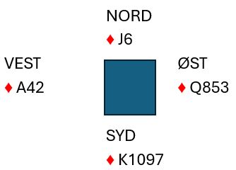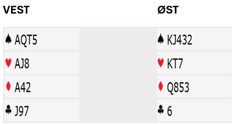 Du har altså spilt ruter ess og ruter til nords knekt, liten fra øst og ruter 9 fra syd. Nord kan ikke spille kløver, det gir avkast for den siste ruteren hos vest, stjeling hos øst. Da spilles for overstikk ved å gjette i hjerter. Om nord spiller hjerter er problemet i den fargen løst.