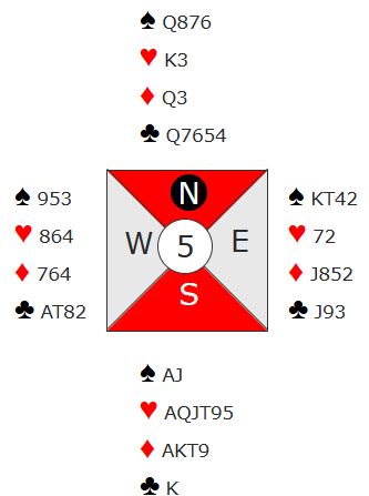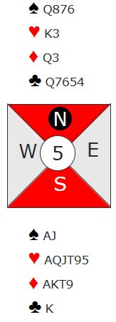 Det var ingen problemer med å få tolv stikk i hjerterkontrakt selv om det ikke ble spilt optimalt, for det satt snilt. Spar konge sitter i saksen, men det er som nevnt ikke nødvendig i hjerterkontrakt som blir spilt av syd. Merk at det står i 6NT også. Men der er det jo ikke noen ruterstjeling på den korteste trumfhånden som gir ekstra stikk. I grandkontrakt må spillefører godspille kløver dame og velge om en spar eller en ruter skal kastes hvis kløver dame gir avkast tidlig. Ruter knekt kan jo sitte singel, dobbel eller tredje på en hånd. Spørsmålet i grandkontrakt blir derfor om spar konge sitter i saks, eller om ruteren gir fire stikk.