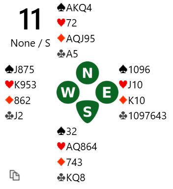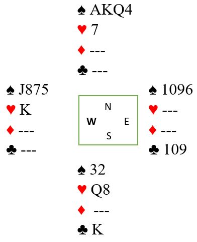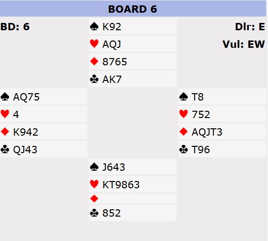 I ett spill ble det åpnet med 2 hjerter med 3-5-3-2 fordeling hvor hjerter konge i femkortsfargen var det eneste honnørkortet. Forstå det den som kan, for mer enn en å være vinnende strategi er vel dette å gjøre om bridgen til en slags bingo? Vel, i det aktuelle spillet ble 2 hjerter doblet med pass rundt da motparten selvsagt også kjenner til den superagro stilen og sikler etter å få inn et stort "number" for doblet beteplukk. Han som hadde åpnet angret seg nok da det gikk dobler og pass rundt, og han var åpenbart litt i sjokktilstand (?), for da han spilte den doblede kontrakten så han ikke at det var bare å være litt forsiktig så ville de bli åtte stikk og en «fet» +470 på bok. Da kunne de slått seg på brystet og sagt, «stilen funker!». Det ble dog en bet, men -100 på det spillet var ikke noe stort drama, kun en misset sjanse. Så i det neste settet kom nok en 2 hjerteråpning (syd) fra samme spiller, og makkeren satt med dette: