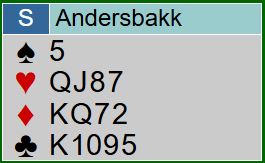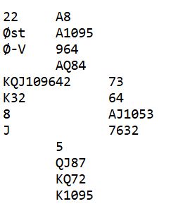 Så det er ikke noe å si på å gå bet i slem selv om det heller ikke er noe å si på å melde slem. Men du har vel også oppdaget at en kløverfinesse kan lykkes. Det gir ikke noe ekstra i sparkontrakt (får jo tre stikk via kløveren ved å stjele den tredje), men det gir det ellevte stikket i grand. Da handler det om å tippe hvor ruter konge sitter. Det går nemlig an å vinne både 6 hjerter og 6 grand med syd som spillefører.