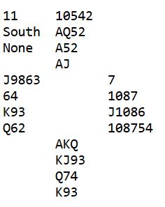 Her har N/S 33HP til sammen. Syd er giver og viser slik de fleste melder 18-19NT i andre runde, og da blir det for de fleste slem.