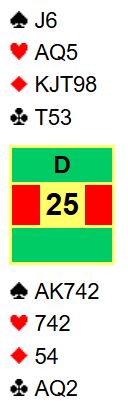 Ved å tippe feil i stikk en og få hjerter over seg var altså alle hjerterne tatt bort og nords hånd nokså ubrukelig. Det bør etter den starten bli kun ett ruterstikk, men det behøves fire for å vinne 3NT! Øst må feile og ta for ruter ess idet det spilles ruter til knekten. For å kanskje kunne friste øst litt ble kløver spilt til damen sånn at kun kløver ess singel lå igjen på bordet, så ruter til knekten. Og så sannelig, en bra spiller på østs plass stakk med esset - en grusom feil og en enorm gavepakke. Øst fortsatte (ivrig) med kløver til esset. En ruterfinesse til gikk fint og damen falt under kongen, 2+1+4+1= 9 stikk.