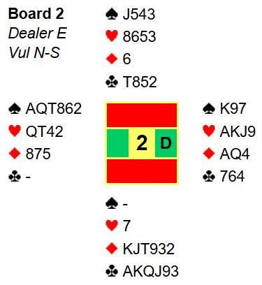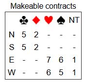Som du ser i diagrammet med "makeable contracts" kan det i teorien vinnes tretten stikk i hjerterkontrakt spilt av øst (om vest er spillefører kan nord spille ut spar mot hjerterkontrakt, og syd får trumfstikk for sin single trumf!).