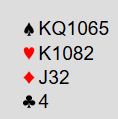 Vi tar med et lite poeng til når det gjelder fargebehandling generelt sett. Merk forskjellen på hjerteren vi nettopp så på (A-Q-9 sjette mot Kongen tredje) og for eksempel: