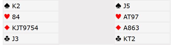 Ved det andre bordet meldte øst inn kun 1 spar. Da fikk syd hoppet til 3 kløver. Det fulgte en lang meldeserie som jeg ikke kan si så mye om uten å kjenne parets avtaler. Syd sa til slutt 6 kløver, men nord avsluttet med 6 ruter. De hadde funnet toppkontrakten som dog måtte spilles litt forsiktig. Men alle som var i 6 ruter (fire av åtte N/S-par) vant den, og en av dem fikk tretten stikk. Det norske paret var alene om å gå bet i 6 kløver. Ett N/S-par til gikk bet i slem, men de var i 6NT. Dessuten var to N/S-par kun i utgang.