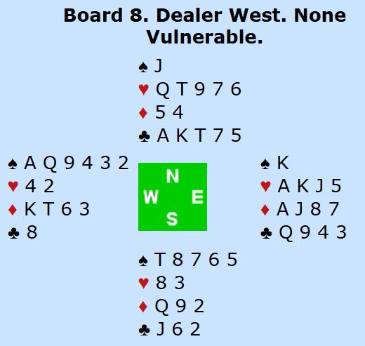 Her er et spill som ved det ene bordet normalt ikke ville vært interessant i lagkamp - en vanlig utgang Ø/V - men i BAM hvor ett ekstra stikk kan avgjøre hvor poengene havner (2-0, 1-1 eller 0-2) er det annerledes. Det ble utgang ved det ene bordet, men ved det andre bordet satt Hoftaniska-Palma Ø/V og var med sitt resultat på spillet sikre på 2-0 i BAM, og de ville heller likt at det var lagkamp hvor store marginer gir en haug med IMP.