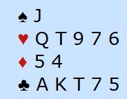 Palma (vest) åpnet med 2 spar. Nord har en ekkel hånd. Sånn er det jo ofte om det må vurderes å melde over en sperreåpning, og man er jo alltid litt bekymret for å bli robbet hvis man ikke melder, eller straffedoblet hvis man melder. Det er nesten nok til å melde, og det kan bli rett å kaste seg innpå om makkeren har tilpasning. Men det er i minste laget, og da nord likevel slengte innpå 3 hjerter var det over.