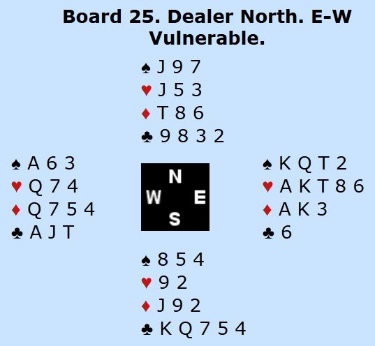 Når en skal spille denne kontrakten (7H) vil det neppe gå fort, for det står mye på spill, og spillefører aner ikke at samme hvordan det spilles blir det tretten stikk siden både spar- og ruterfargen gir fire stikk helt av seg selv.