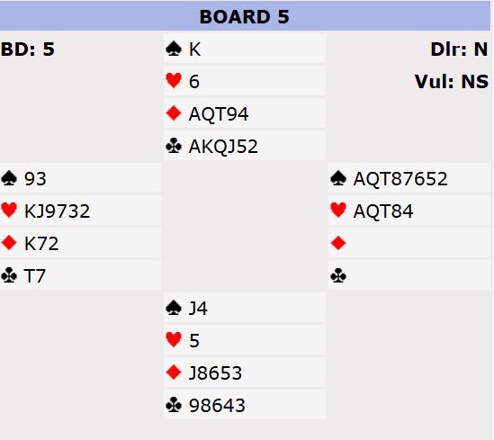 For å være ærlig, den meldingen har jeg sansen for med så fullstendig ekstreme kort. Det går garantert ikke pass rundt. Så kan hun se hvor mange hjerter (eller spar) hun skal melde senere. Motparten kan godt falle for dette. Så å ende opp i en doblet kontrakt hvor motparten får seg en stor overaskelse idet ingen av dere ess og konger gir stikk er mulig. En sånn start på meldingene kan godt føre til en doblet kontrakt med overstikk!