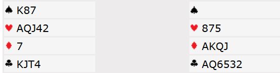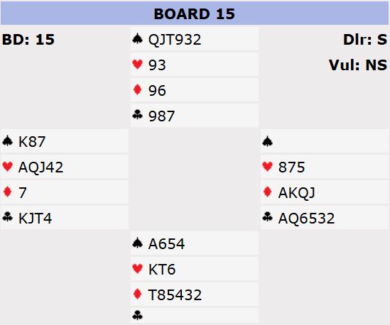 På en måte var dette altså en utspillsbom av meg, i alle fall i forhold til hva syd ønsket seg med doblingen. Han håpet jeg satt med mange kløvere og ville finne kløver i utspill. Paradokset er imidlertid at etter kløverutspill til stjeling vinnes 6 hjerter enkelt. Syd får første stikk for en trumf, men senere fisker spilleførere trumfen, og det ikke mer å hente i motspillet – doblet slem med tolv stikk.