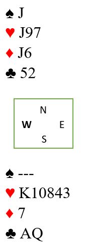 Utspillet vinnes. Så en runde trumf fulgt av at spar 7 trumfes. Så tas for ruter konge og ruter til esset. Nå kommer det vakre sluttspillet, spar knekt spilles med avkast syds ruter 7 idet dette er de gjenværende kortene: